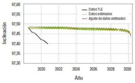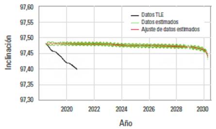 En la figura 4 se presentan los datos de la excentricidad. En este caso es evidente la diferencia entre el ajuste de los datos estimados con la información de los TLE. Esa diferencia se debe a la falta de precisión del orden de metros en los datos iniciales, que se propaga a lo largo de las estimaciones; no obstante, los resultados muestran el comportamiento esperado al reducir la excentricidad media por la caída del semieje mayor, es decir, el arrastre atmosférico tiende a circularizar la órbita.