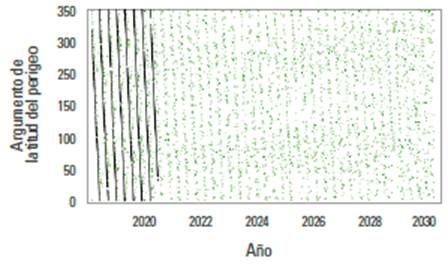Como se explicó, el cambio de la ascensión recta del nodo ascendente es influenciado por la perturbación del achatamiento terrestre y, en este caso, los resultados simulados son muy cercanos a los datos obtenidos del histórico de TLE, mostrando el comportamiento esperado. El mismo comportamiento se observa con la evolución del argumento de latitud del perigeo (figuras 6 y 7).