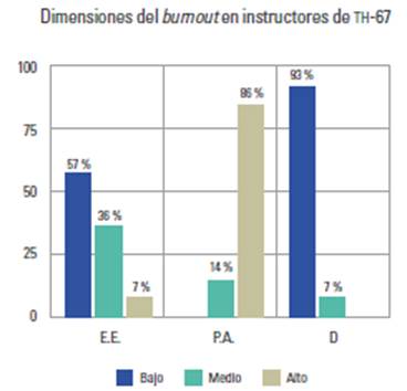 Al hacer un análisis de los factores laborales de los instructores de TH-67 que más afectan la prevalencia y afectación de cada uno de los ítems analizados del burnout, no se puede concluir con seguridad si la carga administrativa afecta el agotamiento emocional que en la población estudiada fue bajo. Sin embargo, esta carga a mayor tiempo e intensidad puede causar agotamiento emocional, que para Patlán (2013) se presenta de manera progresiva y podría desencadenar en el individuo pérdida paulatina de energía, interés y disposición para realizar labores asignadas, debido al cansancio, fatiga y desgaste que producen las tareas inherentes al cargo que desarrollan, o en el caso de los instructores de la FAC, las largas jornadas a las que se encuentran expuestos con labores adicionales como formaciones militares, elaboración de contratos, revisión de documentos, entrenamiento físico y responsabilidades gerenciales en la toma de decisiones.