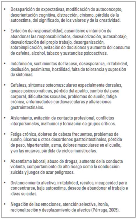 El burnout es un síndrome costoso para los individuos afectados y para las compañías en las que estos laboran, ya que puede causar síntomas como fatiga, falta de concentración, problemas de memoria y cambios de personalidad (desinterés, cinismo, agresión). A la vez, presentan otros signos físicos comunes que incluyen dolores de cabeza, trastornos gastrointestinales y problemas cardiovasculares, que se traducen en detrimento de la producción, productividad, y por ende, aumento de riesgos laborales (Rholetter, 2013). Dentro de los síntomas asociados al burnout, se caracterizan los factores cognitivos, conductuales, emocionales, físicos y defensivos, así (tabla 1):