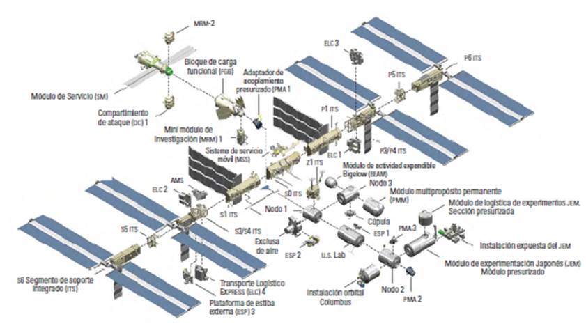 La Estación Espacial Internacional (ISS) (figura 2) es sin lugar a dudas el proyecto de cooperación internacional de ingeniería ultraterrestre más grande de la historia. Se trata de una serie de módulos habitables que se han puesto en el espacio desde 1998, año en que la Agencia Espacial Rusa inició el proyecto. Actualmente, la estructura tiene más de 100 m de largo y orbita la Tierra a 400 km de distancia de su superficie. A la fecha, las cinco agencias espaciales más grandes del mundo participan en el proyecto: la Administración Nacional de la Aeronáutica y del Espacio (NASA), Agencia Espacial Federal Rusa (FKA), Agencia Japonesa de Exploración Espacial (JAXA), Agencia Espacial Canadiense (CSA) y la Agencia Espacial Europea (ESA). Más de 200 personas de diferentes países han visitado la Estación Espacial desde su construcción para llevar a cabo diversos proyectos, tanto de investigación como turísticos, que le han permitido no solo a Estados Unidos sino a las otras potencias espaciales obtener sus propios desarrollos científicos y capacidades para ir y volver del espacio (NASA, 2019; Roscosmos, 20 de abril del 2020; ESA, 10 de junio del 2020).