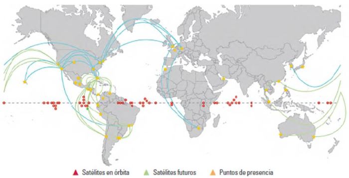 Las empresas que ofrecen el servicio de telecomunicaciones satelitales son muchas más que las que ofrecen el servicio de posicionamiento. Existen grandes compañías privadas que cuentan con los recursos para poner satélites de comunicaciones en órbita o Estados que invierten recursos para este fin. Con ello, pueden recibir una cantidad importante del presupuesto procedente del comercio de servicios a través de sus canales a clientes (como empresas privadas u otros Estados que se ven obligados a adquirir esos servicios teniendo en cuenta que no poseen un satélite propio). Un ejemplo de ellas se presenta en la figura 3, donde se aprecia la flota de satélites geoestacionarios de la empresa Intelsat.