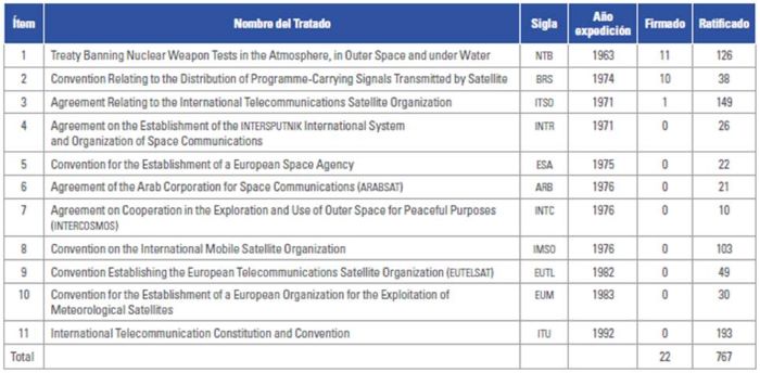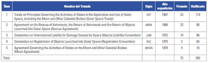 A continuación, se presenta la normativa vigente sobre el uso del espacio exterior. Teniendo en cuenta que fue proferida principalmente por la Organización de Naciones Unidas, y de conformidad con el derecho internacional, esta debe ser firmada y ratificada por los Estados para que sea vinculante. Según los datos presentados por United Nations Office for Outer Space Affairs (de ahora en adelante UNOOSA), a enero del 2020 se encuentran ratificados y firmados los tratados de la siguiente tabla:
