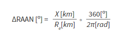 3) The RAAN was taken into account to separate two satellites along the axis X in figure 14. A conversion from distance (km) to angular separation between orbits for satellites of the same constellation was made using the following equation:
