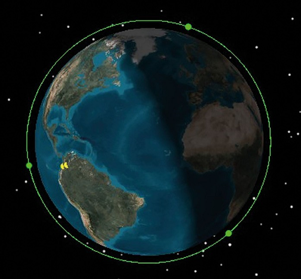 [Ec. 7]Looking for a way to calculate the time it takes a satellite to be on the same spot relative to Earth the following simulation has been created.