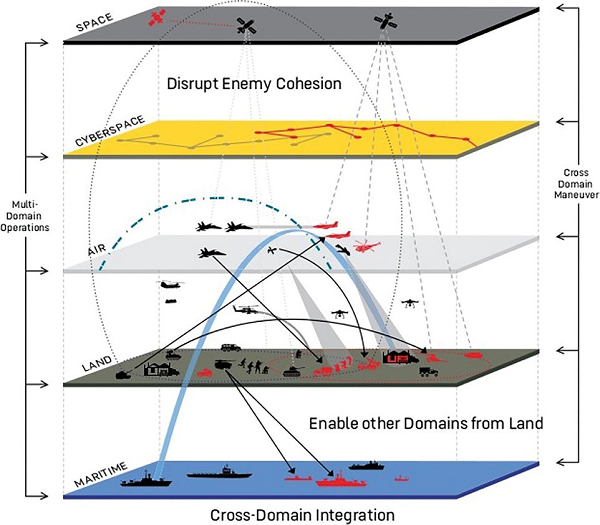 Finally, an integrated system between space, air, land, maritime and cyberspace means is proposed. This system seeks to develop multidomain missions capable of interconnecting the different domains and capacities for specific objectives that project the integration of structures and services, with the purpose of accomplishing operations and meeting the needs of the Colombian territory.