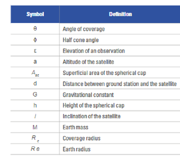 • The minimum elevation of the satellite for the observer, depending if the satellite is used for observations (80º) or communications (20º). This is used to calculate the half cone angle, which is then used to determine the number of satellites in an orbit and the spacing between orbits.