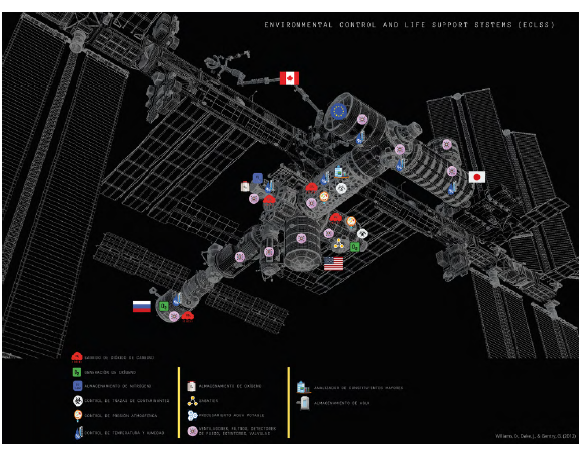 El sistema de control ambiental y de soporte vital (ECLSS, por sus siglas en inglés), como se describe en la Figura 1, consiste en tres componentes: el sistema de recuperación del agua (WRS, por sus siglas en inglés), el sistema de generación de oxígeno (OGS, por sus siglas en inglés) y el sistema de revitalización del aire (ARS, por sus siglas en inglés), que están operativos desde 2008 en la EEI. El WRS permite el reciclaje del agua a partir de la recolección de la orina de la tripulación, y la condensación de la humedad y del agua del sistema de hidratación de las unidades de movilidad extravehicular (EMU, por sus siglas en inglés), con un 90 % de eficiencia en el proceso (Williams et al., 2012). El ARS se encarga de filtrar los contaminantes atmosféricos usando el equipo de control de trazas de contaminantes (TCCS, por sus siglas en inglés) producidos por los componentes electrónicos, la manipulación de equipos, los materiales, etc., y con el soporte del ensamble de reducción de dióxido de carbono (CDRA, por sus siglas en inglés) proveniente de los astronautas (Seedhouse, 2020), usando camas de carbón activado, un oxidante catalítico térmico, hidróxido de litio, electrólisis del agua y del barrido, y reducción del dióxido de carbono, perlas de aluminio para remover el monóxido de carbono y parte del metano (CH4), porque el restante es ventilado al espacio (Peterson, 2013; Stambaugh et al., 2013).