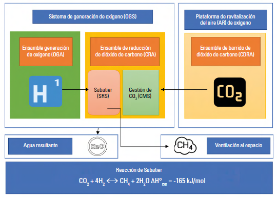 En la EEI, al tener sistemas de circulación cerrados, es posible aprovechar las moléculas derivadas de la generación de dióxido de carbono a través del principio de Sabatier (Vogt et al., 2019), como lo describe la figura 2, reduciéndolas con un catalizador a temperaturas entre 300 y 500 °C con el hidrógeno para que se produzca gas metano (CH4), que es ventilado al exterior, y agua para consumo (Barratt et al., 2020), con una eficiencia del 90 al 100 % (Ley et al., 2009).