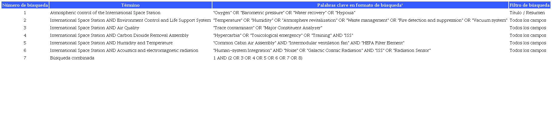 Se realiza una revisión de la literatura a través de la búsqueda de publicaciones en bases de datos como Scopus, Ovid, arXiv.org, SAGE, BioMed, ClincalKey, Pro-Quest, EBSCO, SpringerLink, Web of Science, Google Scholar y Pubmed (desde 2000 hasta 2022). Se usaron palabras clave de acuerdo con la estrategia descrita en la tabla 1 y se consideraron las publicaciones en inglés relevantes del ambiente de cabina de la EEI. Se excluyen aquellas publicaciones que consideran aspectos del sistema de control ambiental como propuestas teóricas y en unidades de movilidad extravehicular, además de aquellas cuyo texto completo no se pudo recolectar.