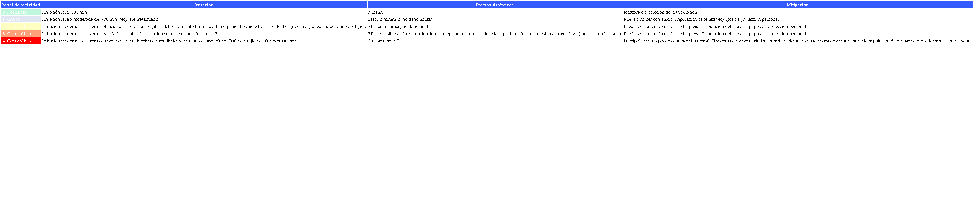 Otros sensores dispuestos en la EEI incluyen: el monóxido de carbono (CO) mediante un detector electroquímico (SEQ); cianuro de hidrógeno y cloruro de hidrógeno entre 0,4 y 30 ppm; amonio mediante colorimetría entre 2 y 700 ppm en la cabina y dentro de las escotillas entre 15 y 90 ppm; hidracina entre 25 y 300 ppb; y tetróxido de nitrógeno entre 0,75 y 3 ppm (Nicogossian et al., 2016). La exposición a un ambiente respirable con incrementos de estas sustancias puede incapacitar al astronauta y producirle la muerte en poco tiempo (American Conference of Governmental Industrial Hygienists [ACGIH], 2020; Cameron et al., 2020).