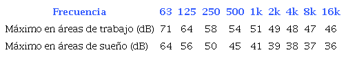 Para las operaciones orbitales de la EEI, se establecen los límites de presión de sonido continuo en bandas de octavos de decibeles (dB) re-20 μPa sin elementos de protección personal según la frecuencia en Hertz (Hz), como se describe en la tabla 3.