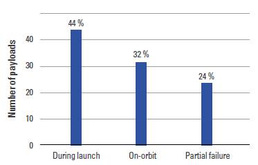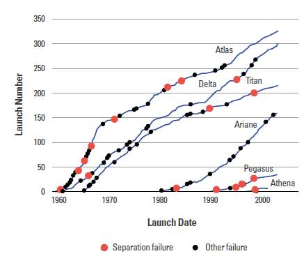 La figura 1 muestra las estadísticas de falla de cien cargas útiles a bordo de 91 misiones espaciales de la última década (2009-2019), analizadas en Katttakuri (2019); el 44 % de las cargas fue perdido antes de alcanzar la órbita, es decir, en las fases de lanzamiento y separación, cuando todos los sistemas de separación que utilizaban estas misiones fallidas utilizaban mecanismos pirotécnicos. La figura 2 representa fallas históricas en el evento de separación mediante puntos rojos que representan los fallos de este sistema en los lanzamientos de varias familias de cohetes.