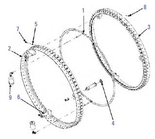 En la figura 11, el diagrama ilustra el sistema de separación de etapas: los componentes 2 y 3 son las dos juntas radax que van acopladas a las etapas del cohete. Según la patente, las juntas radax pueden ser unidas o acopladas mediante varios mecanismos como sujetadores, arandelas e insertos roscados, mostrados como los componentes 7, 5 y 8, respectivamente. Por otra parte, el dispositivo tipo vejiga aplanada 1 estará situado entre los miembros radax 2 y 3, acoplada a su sistema de inflado 9, así al activarse se aplicará la fuerza de separación de bajo choque o impacto que permitirá la separación de las juntas radax. Por último, los componentes 6 y 4 solo son implementados cuando el cliente necesita que el sistema tenga dispositivos pirotécnicos, siendo el componente 6 un actuador tipo pistón pirotécnico y el componente 4 una arandela que ayuda a mantener el pistón en su lugar de carcasa.