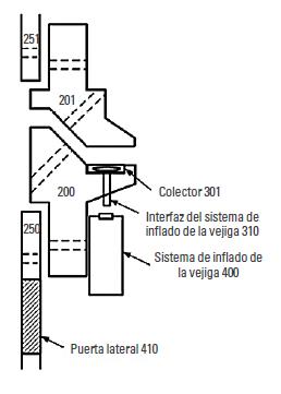 La figura 12 muestra un diagrama de la sección transversal del sistema de separación de etapas. Aquí se aprecia mejor el dispositivo tipo vejiga aplanada mostrada en la figura como una forma ovalada dentro del colector 301; está localizada entre las juntas radax 200-201, que a su vez tienen unas plataformas específicas para la vejiga aplanada que al momento de inflarse aplica una fuerza que separa las juntas acopladas a las etapas del cohete 250-251. Este mecanismo, según la patente, puede ser fabricado con cualquier metal (como el acero). La figura 12 también presenta el sistema de inflado de la vejiga 400, la interfaz del sistema 310 y el colector o tubo 301 hacia la vejiga. El sistema de inflación de la vejiga, según la patente, puede ser cualquiera que permita su inflado, por ejemplo, los generadores de gas caliente que pueden ser activados eléctricamente.