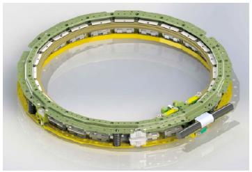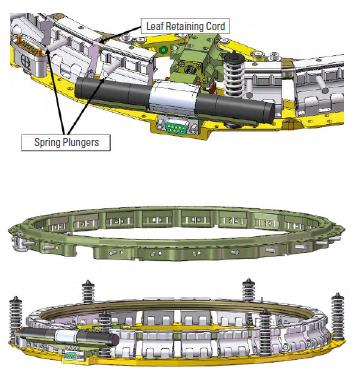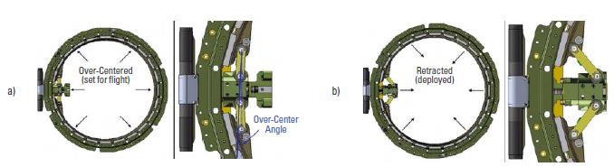 El sistema lightband está compuesto por varios anillos, un motor eléctrico para la activación del sistema, resortes, pasadores, eslabones y tubos deslizantes, entre otros. El funcionamiento del dispositivo se divide en dos estados. En el primer estado (figura 4.a), el sistema está recogido y allí el anillo de retención ejerce una compresión, presionando los sujetadores de los anillos hacia afuera del anillo superior. En el segundo estado (figura 4.b), el sistema se ha iniciado por medio del accionamiento de los motores eléctricos para que el mecanismo encaje hacia adentro y el anillo de retención se retraiga.