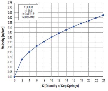 De acuerdo con el manual, la velocidad de separación es en función de las masas de las etapas a separar y también del número de resortes de separación utilizados en el sistema, siendo seis el número mínimo de resortes que garantizan una separación confiable. En el manual, hay fórmulas que ayudan a determinar la cantidad de resortes requeridos para una velocidad dada, o viceversa. La relación velocidad-cantidad de resortes es mostrada en la figura 6.