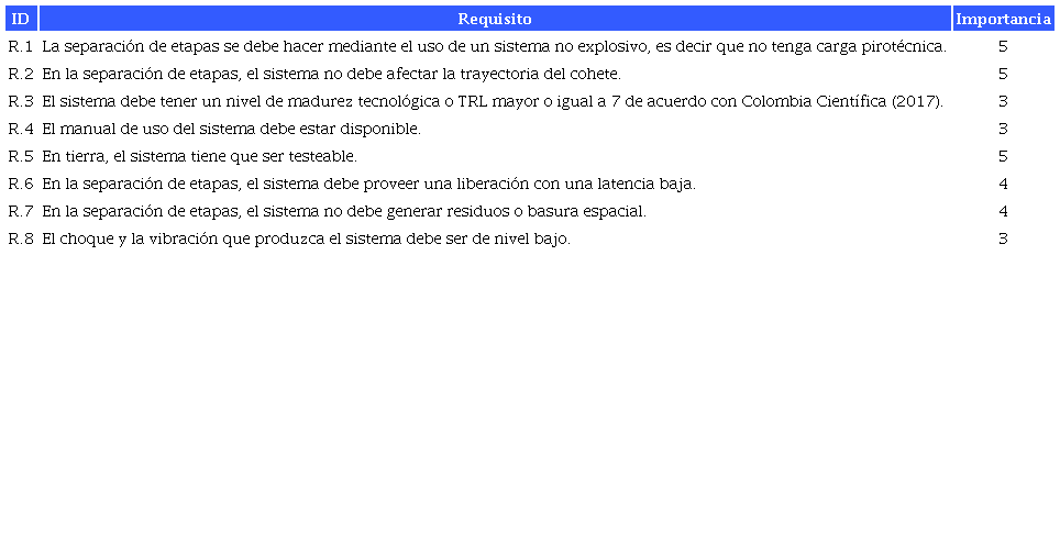 Para tener una mejor decisión a la hora de seleccionar un sistema apropiado, se elaboró una lista de parámetros o requisitos que el sistema debería cumplir. La escogencia de estos es un proceso clave porque, según estos parámetros, los futuros stakeholders o interesados en este tipo de proyectos podrán hacer uso del sistema de separación; y, por otro lado, se piensa que los requisitos son la clave para un proyecto o sistema exitoso. Los requisitos planteados tienen una importancia que va de 5 a 1, siendo 5 la más importante y 1 la menos importante, mostrados en la tabla 1.