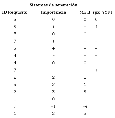 La última parte de la investigación fue el análisis de los sistemas considerados. Se utilizó la metodología de tamizaje de conceptos o evaluación QFD; los requisitos planteados se evaluaron en cada uno de los sistemas considerados por medio de la matriz de tamizaje de conceptos mostrada en la tabla 3, que permite evaluar y comparar cada uno de los sistemas. En esta matriz, el signo "+" representa que el sistema es mejor que los demás en el requisito correspondiente, el signo "-" representa que el sistema es peor que los otros, el número "0" simboliza que el sistema es igual a los demás en dicho requisito y "/" representa que no se encontró información sobre el requisito respectivo. Junto a esta matriz de tamizaje, se realizó una descripción de algunas especificaciones para los requisitos de cada sistema. Finalmente, para concluir cuál es el sistema de separación de etapas que mejor cumple con los requisitos establecidos, se restan las calificaciones positivas de las negativas y se ordenan ascendentemente según su calificación final.