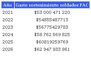 2. El presupuesto asignado para el sostenimiento de los soldados que cumplen con su servicio militar obligatorio en la FAC es variable. Esto en razón a que la bonificación mensual a la que tiene derecho un soldado está basada en el salario mínimo legal mensual vigente, y también se ve afectado por la cantidad de soldados que se incorporan.