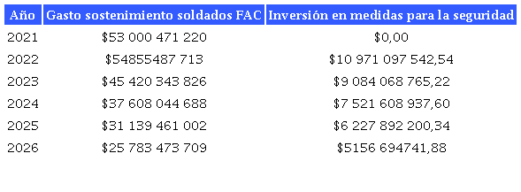 Al hacer una disminución progresiva del personal de soldados, de acuerdo con la situación específica de cada Unidad Militar Aérea y su nivel de riesgo, podría plantearse que durante cada año se ejecutara una utilización equivalente al 20 % del presupuesto, con el fin de potencializar las actuales medidas para la seguridad. Esto quiere decir que cada año, a partir del 2022 para este caso, tomando como ejemplo que se imple-mente la presente propuesta, un aproximado de los gastos en el sostenimiento del sistema de seguridad y defensa de bases aéreas sería lo expuesto en la tabla 5.