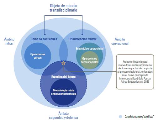 La imagen muestra tres ámbitos que se abordan para el estudio, y son: el militar, que involucra a la toma de decisiones en las operaciones aéreas; el operacional, el cual aborda los niveles estratégico y operacional, enmarcado en las operaciones aeroespaciales; y en seguridad y defensa, donde se encuentran descritos los estudios de futuro, que a través de una metodología crítico-constructivista permitieron generar la narrativa para alcanzar el propósito del presente estudio.