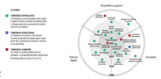 La figura 2 proporciona una mirada compleja desde aristas correspondientes al entorno digital, la sociedad y la geopolítica y guerra, con el cual se puede crear una lectura al entorno operacional de la seguridad y defensa al 2040.