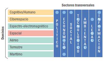 Los dominios (barras horizontales del diagrama) se encuentran diagramados empleando el código de colores de semaforización, siendo los de color verde aquellos que en la actualidad las Fuerzas Armadas del Ecuador los ha operacionalizado; en lo concerniente a los rectángulos de color amarillo, se los identifica como los espacios donde existe materia doctrinaria en desarrollo y su funcionalidad es creciente; y por último, el color rojo representa el dominio que se encuentra en un temprano desarrollo, donde aún su norma, doctrina, estrategias y tácticas están en proceso de elaboración. Las barras verticales, representan los sectores transversales que contextualizan al Estado.