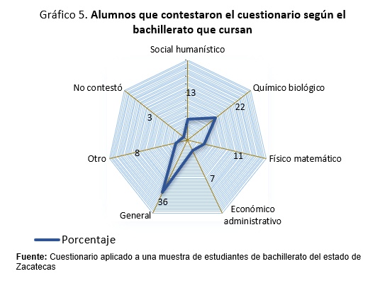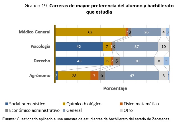 Al buscar la información respecto a las carreras que destacan en la preferencia de los alumnos de nivel medio superior según el tipo de bachillerato que cursa, se observó que predomina el bachillerato general autónomo respecto a los demás tipos de bachillerato, con los porcentajes de 46% para médico general, 30% licenciatura en psicología, 36% licenciatura en derecho y 33% ingeniero agrónomo. Esto permite deducir que los alumnos que provienen de este bachillerato se insertan preferentemente en las carreras tradicionales comparativamente con quienes provienen de los demás tipos de bachillerato que se encuentran fuera del área urbana.
