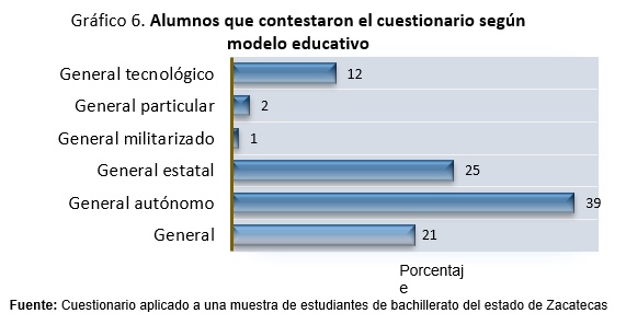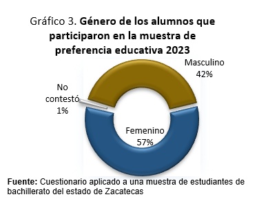 La muestra base de este estudio incluye 1 124 alumnos de bachillerato que se distribuyen en 44 municipios de los 58 que integran el estado de Zacatecas. La distribución de la muestra nos permite afirmar que el municipio de Zacatecas aportó un 26%, Guadalupe el 19% y Fresnillo con un 6%. La participación del resto de los municipios fue igual o menor al 3%. En el universo de los alumnos que contestaron el cuestionario predominó el género femenino con 57%, masculino 42% y no contestó el 1%.