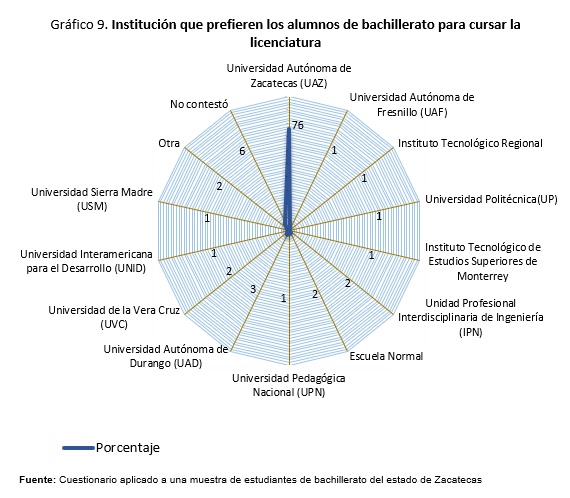 Al preguntar sobre la institución en la que ha pensado continuar con sus estudios universitarios se obtuvo que el 76% de los alumnos considera a la Universidad Autónoma de Zacatecas, 3% a la Universidad Autónoma de Durango, la preferencia por el resto de las instituciones oscila entre el 2 y 1%. El 6% no contestó.