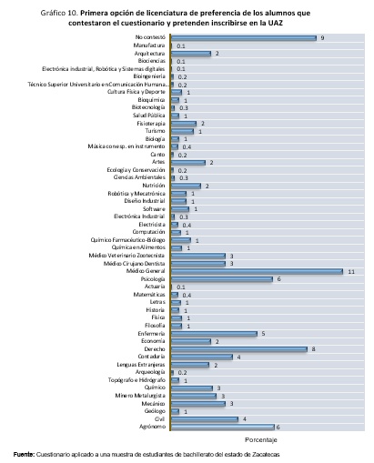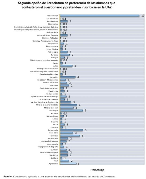 De los 54 programas académicos que ofrece la Universidad Autónoma de Zacatecas, las carreras de mayor preferencia fueron las siguientes: Medicina General 11%, Derecho 8%, Agronomía y Psicología con el mismo porcentaje 6%, Enfermería 5%. Con fines informativos se añaden en la parte de anexos la segunda y tercera opción de preferencias en gráficas.
