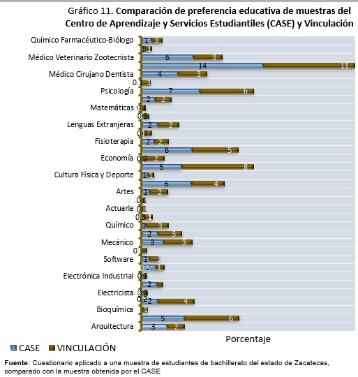 El gráfico siguiente muestra un comparativo de la preferencia educativa entre dos mediciones a la misma población, una practicada por el Centro de Atención y Servicios Estudiantiles (CASE) y otra por la Coordinación de Vinculación (CV). La primera se llevó a cabo un mes antes de la Expo Orienta 2022 mediante una encuesta vía correo electrónico. La segunda realizó una encuesta presencial en formato físico a los asistentes de la Expo Orienta 2022. Con la información obtenida, se realizó un comparativo, que arrojó los siguientes resultados: para Medicina General 14% CASE y 11% CV, Licenciatura en Derecho 5% CASE y 8% CV, Ingeniería en Agronomía 5% CASE y 6% CV, en Licenciatura en Psicología 7% CASE y 6% CV, por último, Licenciatura en Enfermería 6% CASE y 5% CV.