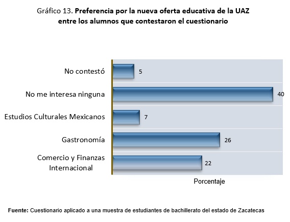 De la nueva oferta educativa de la UAZ se observó que el 26% se inscribiría a la licenciatura en gastronomía, el 22% a la licenciatura en comercio y finanzas internacionales, el 7% a la licenciatura en estudios culturales mexicanos, al 40% no le interesa ninguna y el 5% no contestó.