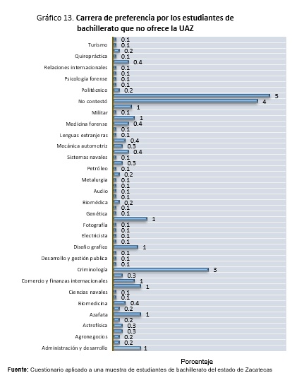Respecto a la preferencia por las carreras que no ofrece la UAZ, las que mostraron mayor porcentaje fueron educación con 5%, criminología con 3% y con 1% cinematografía, gastronomía, administración y desarrollo, azafata, comercio y finanzas internacionales, mercadotecnia y diseño gráfico.
