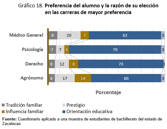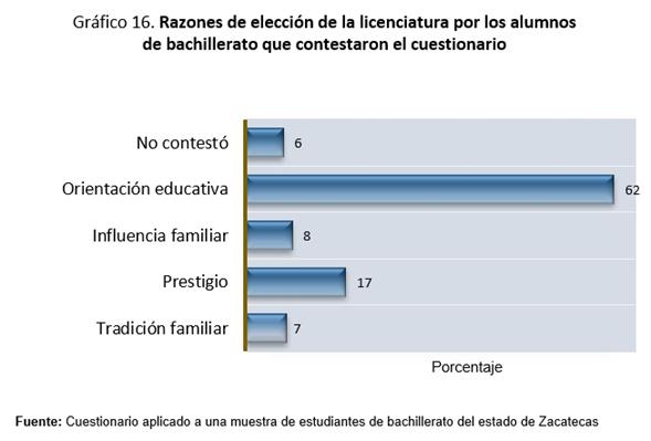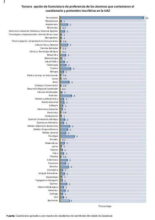 De la nueva oferta educativa que ofrece la UAZ, la mayoría optaría por gastronomía. Y acerca de las carreras de preferencia que no oferta la UAZ, la de mayor porcentaje fue educación, seguido de criminología principalmente. El origen de la razón de elegir carrera está en la escuela más que en la familia. La decisión acerca de qué licenciatura cursar resulta de alto impacto: sus consecuencias afectarán el resto de la vida de los jóvenes. La información de que disponemos permite entender que hay tres factores asociados a esta resolución: social, familiar y escolar; en nuestra encuesta, el primero se expresa en la variable prestigio, el segundo en tradición familiar e influencia familiar en tanto que el restante aparece como orientación educativa.