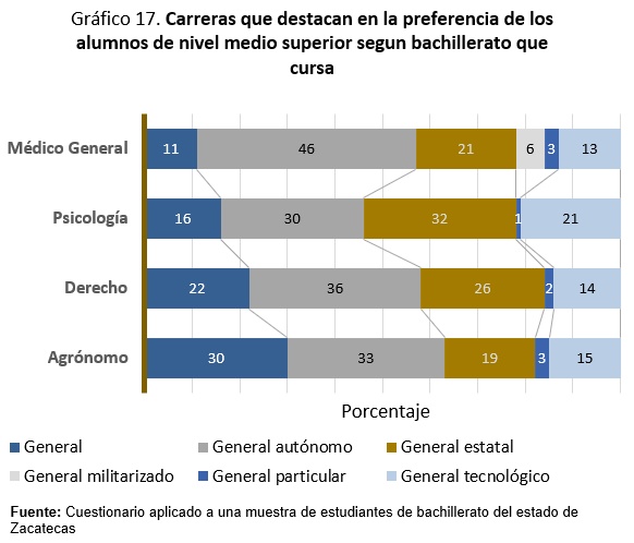 Al indagar sobre las carreras que destacan en la preferencia de los alumnos en el nivel medio superior según el bachillerato que cursan, predomina el general autónomo. Esto permite deducir que los alumnos que provienen de este bachillerato se insertan preferentemente en las carreras que se ejercen en el medio urbano.