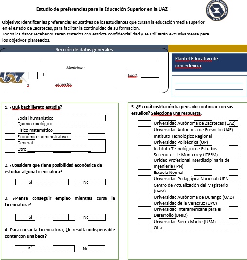 Para alcanzar los objetivos planteados en el presente estudio sobre preferencias educativas, se diseñó un cuestionario que se puede consultar en la parte de anexos para la recolección de datos que se aplicó en el evento Expo Orienta denominado “Forjemos el futuro con el arte, la ciencia y el desarrollo cultural”, organizado por el Centro de Aprendizaje y Servicios Estudiantiles (CASE) que tuvo lugar en el Multiforo Zacatecas el 17 de noviembre del año 2022 de las 9:00 a las 14:00 Horas.