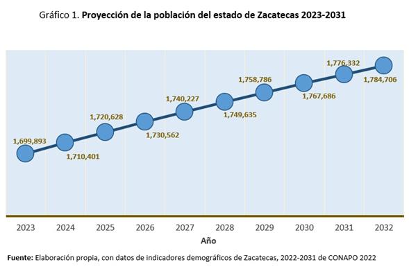 De acuerdo con los Datos de Proyecciones de la población de México y las Entidades Federativas, 2020-2030 (CONAPO, 2021) la población del estado de Zacatecas en el año 2031 será de 1 726 344 habitantes.