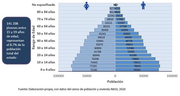De la distribución de la población en quinquenios según edad destaca que 141 208 jóvenes entre 15 y 19 años de edad representan el 8.7% de la población total del estado y se encuentran en la situación de elegir su siguiente opción educativa que pudiera ser la licenciatura (INEGI, 2022).