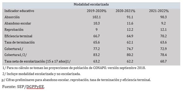 Referente a los indicadores educativos de los periodos 2019-2020, 2020-2021 y 2021-2022 de educación media superior se observa que en absorción en el primer periodo se obtuvo un 102.1%, en el segundo 91.1% y durante el último con un porcentaje más bajo 90.3%; en abandono escolar se muestra que en 2019-2020 fue un 10.3%, en 2020-2021 11.6% y en 2021-2022 fue de 9.2%; según el indicador en reprobación en el 2019-2020 un 9% de alumnos no cursaron satisfactoriamente, mientras que en el periodo 2020-2021 12.2% y de 2021-2022 12.1%; en cuanto a eficiencia terminal en el primer periodo se indica un 66.7%, durante el segundo 64.9% y 70.2% en el tercero; en referencia a la tasa de terminación se arrojó que durante el 2019-2020 un 65.6% terminó, mientras que en el 2020-2021 el 62.1% y en el 2021-2022 el 63.6%; en cobertura que considera las proyecciones de población de CONAPO, en el primer periodo se cuenta con un 77.2%, durante el segundo 74.7% y en el tercer periodo un 72.9%, para la cobertura que, además de estas proyecciones, tiene en cuenta también a las modalidades escolarizada y no escolarizada en el primer periodo 83.2%, en el segundo 80.2% y en el tercero 78.4%, en lo que concierne a la tasa neta de escolarización en un rango de edad de 15 a 17 años se observó que durante el 2019-2020 se presentó un 63.2%, en 2020-2021 un 62.2% y en 2021-2022 el 60.7% (SEP, 2021-2022).