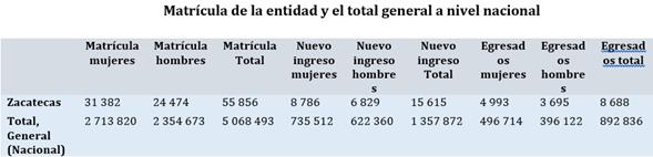 En el estado de Zacatecas la oferta educativa de licenciatura se integra por 90 instituciones de acuerdo a las cifras oficiales de la SEDUZAC (2022). Se describe en la primera tabla: matrícula, nuevo ingreso y egreso en hombres y mujeres, los datos proporcionados por parte de la ANUIES [vi] en la entidad de Zacatecas del ciclo escolar 2021-2022, la matrícula de la entidad y el total general a nivel nacional. En las siguientes tablas se muestran indicadores de la entidad de Zacatecas en la modalidad escolarizada y no escolarizada de educación superior a nivel estatal del documento: Principales cifras del ciclo 2021-2022 [vii] (SEP, 2022, p. 136).