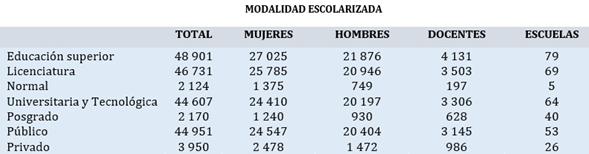 La educación superior en México se ha expandido y diversificado, actualmente son más de 4 millones y medio de estudiantes y más de 384 600 estudiantes de posgrado. Los grandes pilares señalados en la agenda educativa tienen que ver con la educación como derecho humano y emancipación de los sujetos, la vinculación con las comunidades, así como el compromiso social y ambiental. En México, la educación superior comprende los niveles de normal licenciatura, licenciatura universitaria y tecnológica y posgrado. [v] El posgrado es posterior a la licenciatura y se divide en: especialidad, maestría y doctorado. Su objetivo es lograr en los educandos una alta especialización en las diferentes áreas del conocimiento. De cien alumnos que entran a la primaria, solo 50 de ellos terminan el nivel medio superior y de esos cincuenta aproximadamente solo 27 terminan la licenciatura.