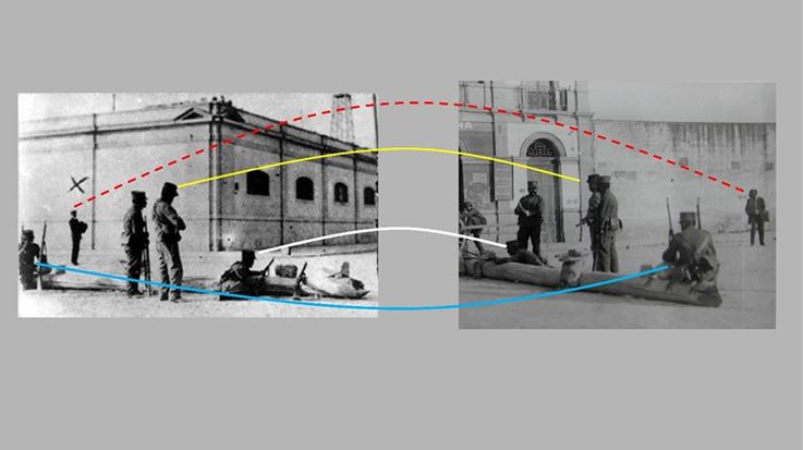En esta segunda fotografía vemos con un poco de dificultad la parte posterior de la pieza de artillería y a la izquierda una carreta que transporta las municiones. El carro y el obús se encuentran estáticos y en la misma posición de la fotografía anterior apuntando hacia la desembocadura oriente de la calle de San Antonio por lo que es posible que esta fotografía haya sido capturada momentos después (Fig. 5). El carro de municiones porta granadas que están organizadas en un todo, formado por: la espoleta, el cuerpo del proyectil, el estuche, la carga y el estopín. Los soldados solían adquirir granadas de dos clases: una que estallaba al choque contra el terreno o cuerpos duros con efectos de demolición, y la Schrapnel, diseñada para ir en contra del personal (Cervantes, 2019).