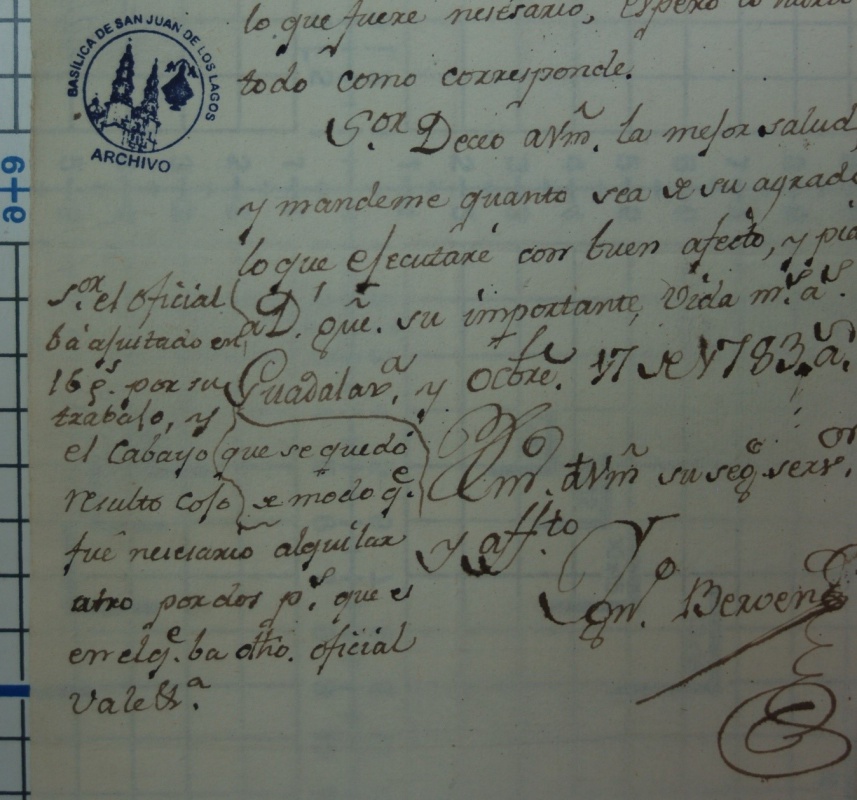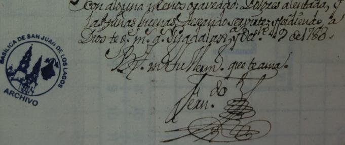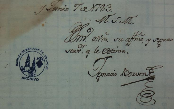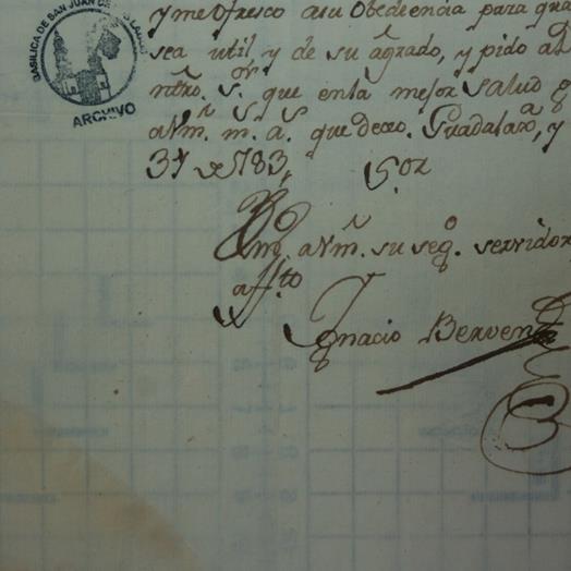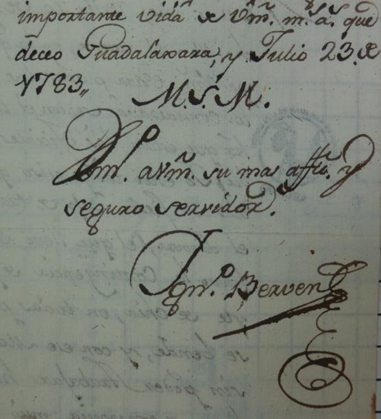 También manifiesta que, con el favor de Dios, a principio del mes entrante, es decir, agosto, él arribará a San Juan y que esté prevenido con el avío, como se lo manifestó en el correo semanario, que los mozos recogerán y regresarán con dicho avío. También le comunica que, inicialmente pensó en quedarse con los dos caballos, pero llegó a la conclusión de que cuando llegara no tendría donde alojar a dichos jumentos y no se le fueran a perder si no tenía la seguridad en su casa de que los caballos estuvieran cómodos y seguros. Fechada en la ciudad de Guadalajara, el 23 de julio 1783 y signada por Ignacio Berben (ACNSSJLJM, documento 3).