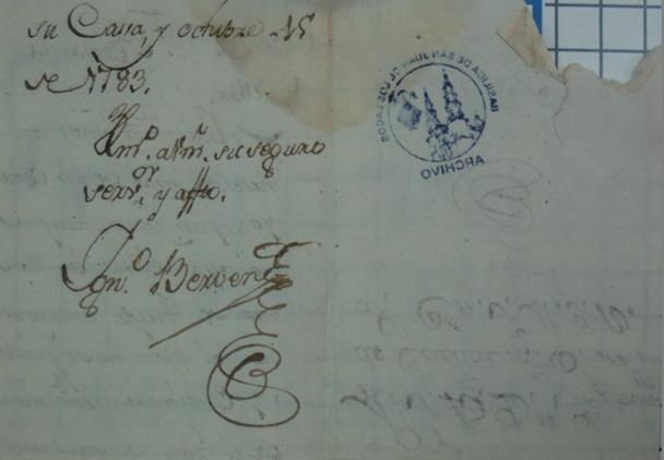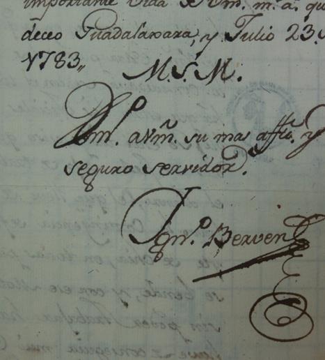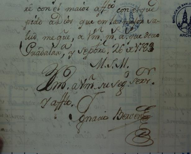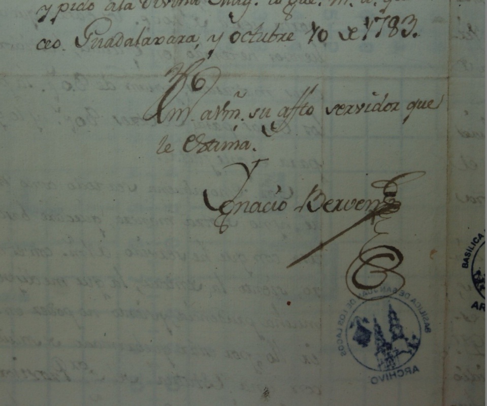 Continúa Berben con la despedida acostumbrada deseándole a Don Vicente mejor salud y el pintor estará a su obediencia para cuanto se le ofrezca. Signada el 31 de julio de 1783 en Guadalajara (ACNSSJLJM, documento 8).