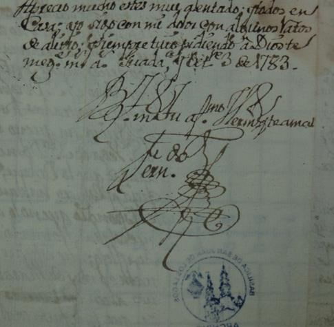 Que Dolores alentada y las niñas buenas desando servirle y pidiendo a Dios que se mejore. Signada en octubre nueve de 1783 en Guadalajara. Tu hermano que te ama. Fernando (ACNSSJLJM, documento 11).