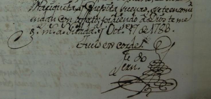 Y para despedirse le desea que se mantenga en alivio y no tenga ninguna novedad en casa, también le externa Fernando que tiene ratos y días de alivio, además que Dolores, Mariquita y Chepita están bien y le envían su afecto y le piden a Dios que se mejore. Fechada el 17 de octubre de 1783 en la ciudad de Guadalajara. Signada Fernando (ACNSSJLJM, documento 15).