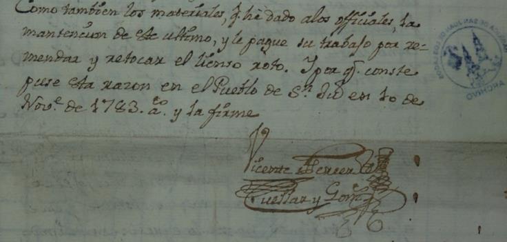 En el correo venidero daré a vuestra merced aviso del estado en que está, y mandaré a vuestra merced una puntual medida para que el carpintero tenga si no hechos los sus bastidores bien labradas sus maderas, para que no le verifique lo que en éstos, que lo que en quince días sobraba tiempo, ha sido necesario cerca de dos meses, y a mi se me seguirá mucho perjuicio, con demorarme, por los muchos quehaceres que tengo a mi cuidado pues solamente el haberle prometido vuestra merced que iría me hace atropellar con todo (ACNSSJLJM, documento 8).