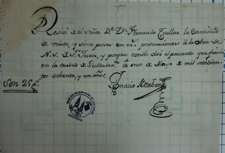 Recibo privado de puño y letra signado por Ignacio Berben, en el cual hace constar que el Bachiller Fernando Cuéllar le entrega un anticipo de ciento veinticinco pesos en reales a cuenta del total de los cuatrocientos, que esta última cantidad debieron de haber firmado por la hechura de las pinturas de la sacristía de la Catedral de Nuestra Señora de San Juan de los Lagos. Dicho adelanto le fue entregado en la ciudad de Guadalajara capital del Reino de la Nueva Galicia, el 23 de abril de 1781 (ACNSSJLJM, Documento 1). [ii]